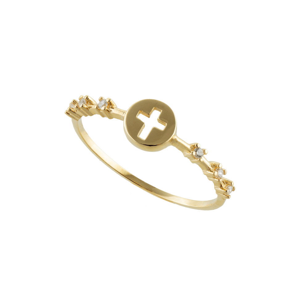 Refined 18K gold ring featuring a polished round medallion with a cut-out cross at the center, accented by delicate diamonds along the band. This elegant design blends faith and sophistication, creating a timeless piece that’s both meaningful and stylish. Perfect for everyday wear or as a thoughtful gift.