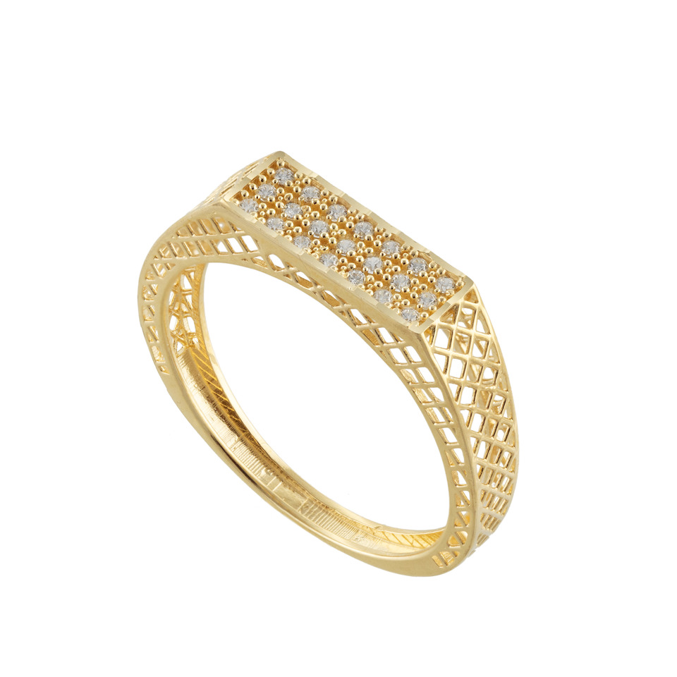 18K gold ring featuring a bold geometric design with an openwork band and a rectangular top fully adorned with shimmering pavé-set diamonds. The intricate structure adds depth and sophistication, creating a striking yet refined piece that stands out while remaining elegant. A modern statement with luxurious brilliance 💛💎