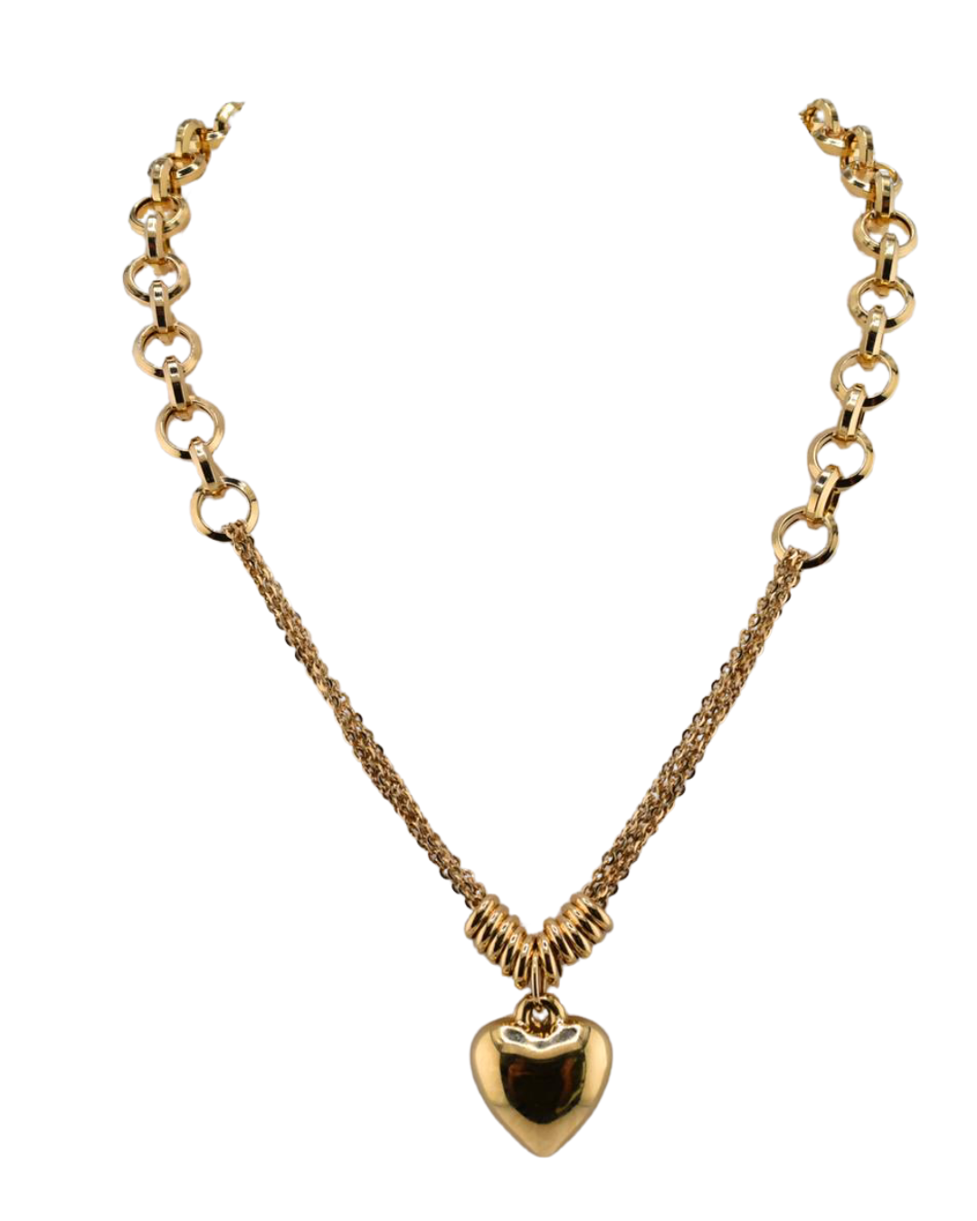Uma combinação perfeita de romance e modernidade. Este colar em ouro 18K apresenta uma corrente Rollo grossa e polida, combinada com um deslumbrante pingente de coração e um fecho Mariner grande . Com 45 cm , ele se destaca como peça central do seu visual. Criado para quem não tem medo de se destacar, é a expressão máxima de luxo e amor.